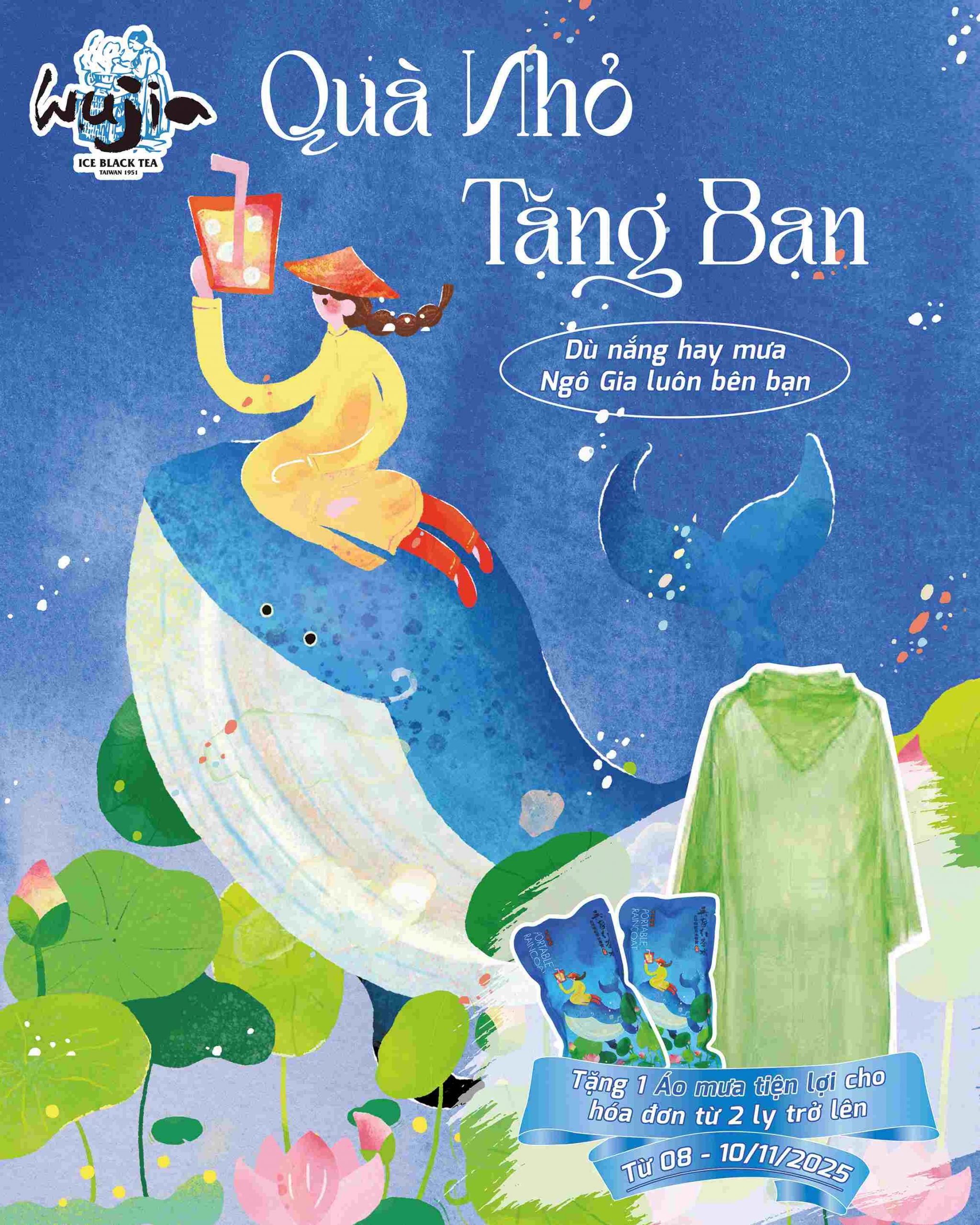 Đã vào tháng 11 nhưng mưa vẫn chưa thôi, dù thời tiết có khó chịu như thế nào Ngô Gia luôn muốn đồng hành với mọi người. Từ 08 – 10/11/2025, mỗi hóa đơn mua trực tiếp tại tất cả cửa hàng thuộc hệ thống Hồng Trà Ngô Gia từ 2 thức uống trở lên sẽ được tặng kèm 1 Áo mưa tiện lợi.💙
