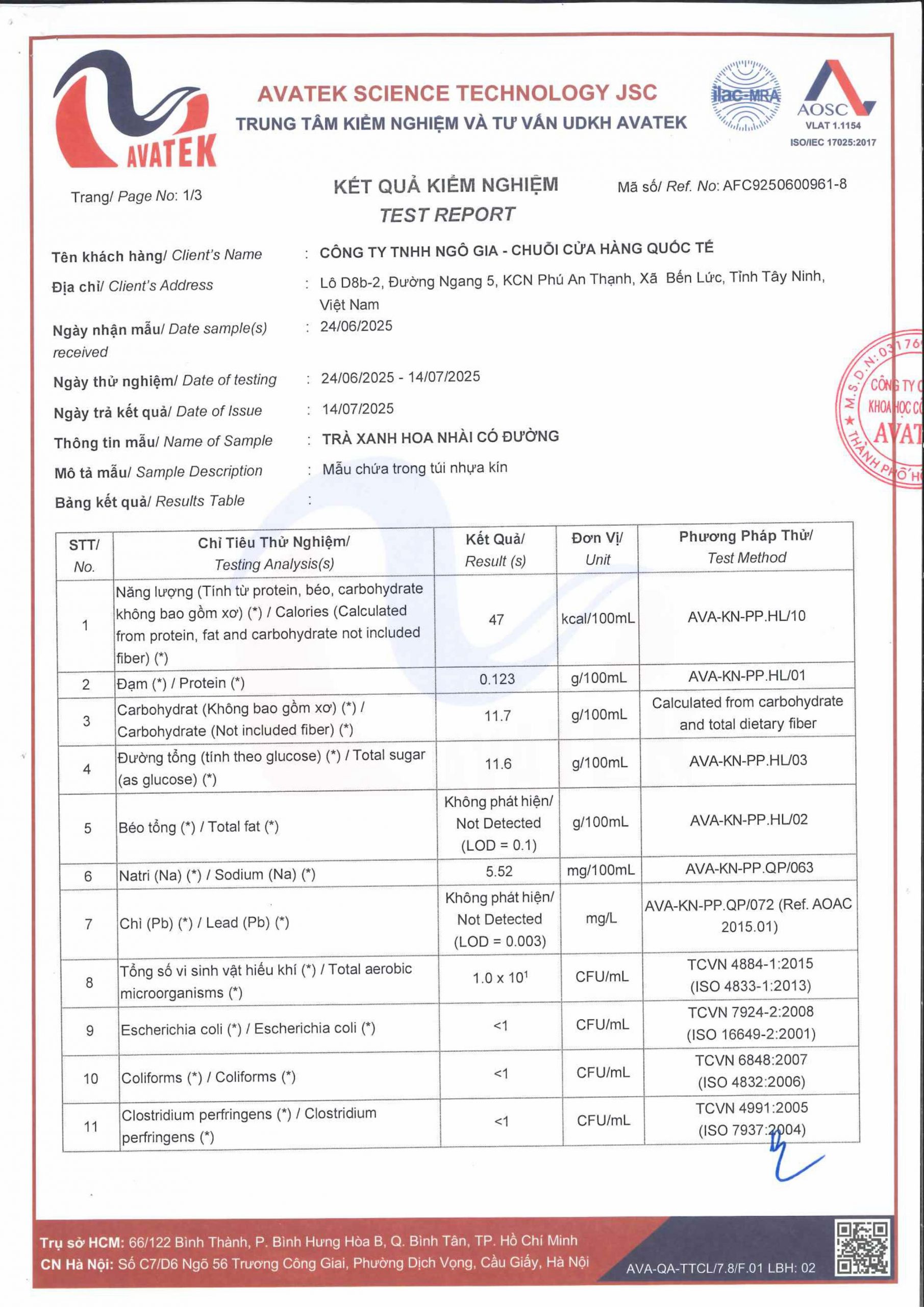 1. Tên sản phẩm: TRÀ XANH HOA NHÀI CÓ ĐƯỜNG